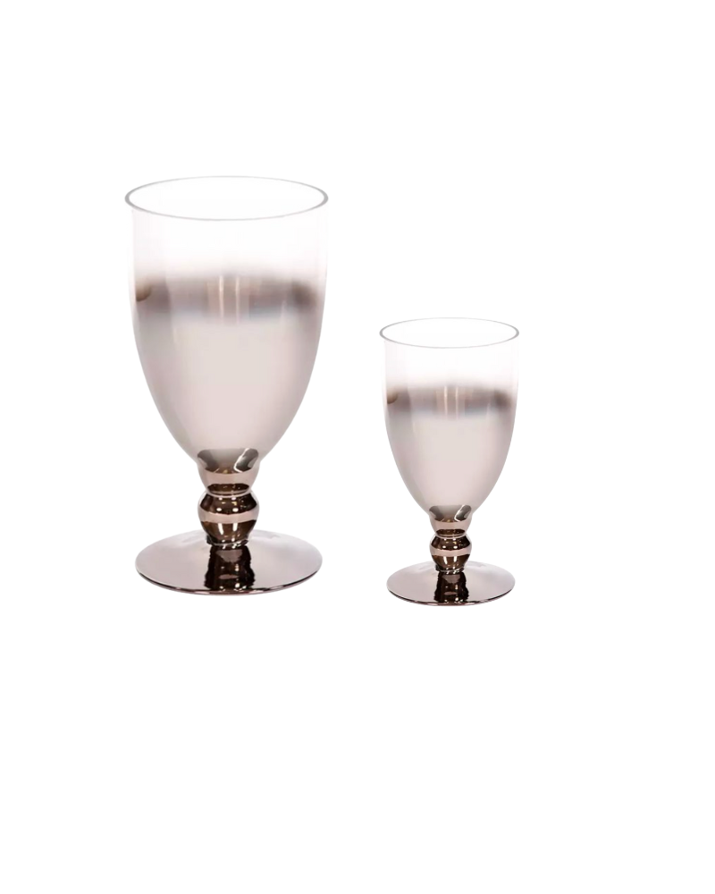 These Howard Elliott vases embody modern elegance with their sleek, metallic finish and sculptural silhouette. Crafted with a soft gradient sheen that transitions from a warm champagne tone to a reflective silver base, each vase rests on a rounded pedestal for a timeless, elevated look. Perfect as standalone statement pieces or paired together, they bring sophisticated shine and refined balance to consoles, dining tables, or built-in displays.